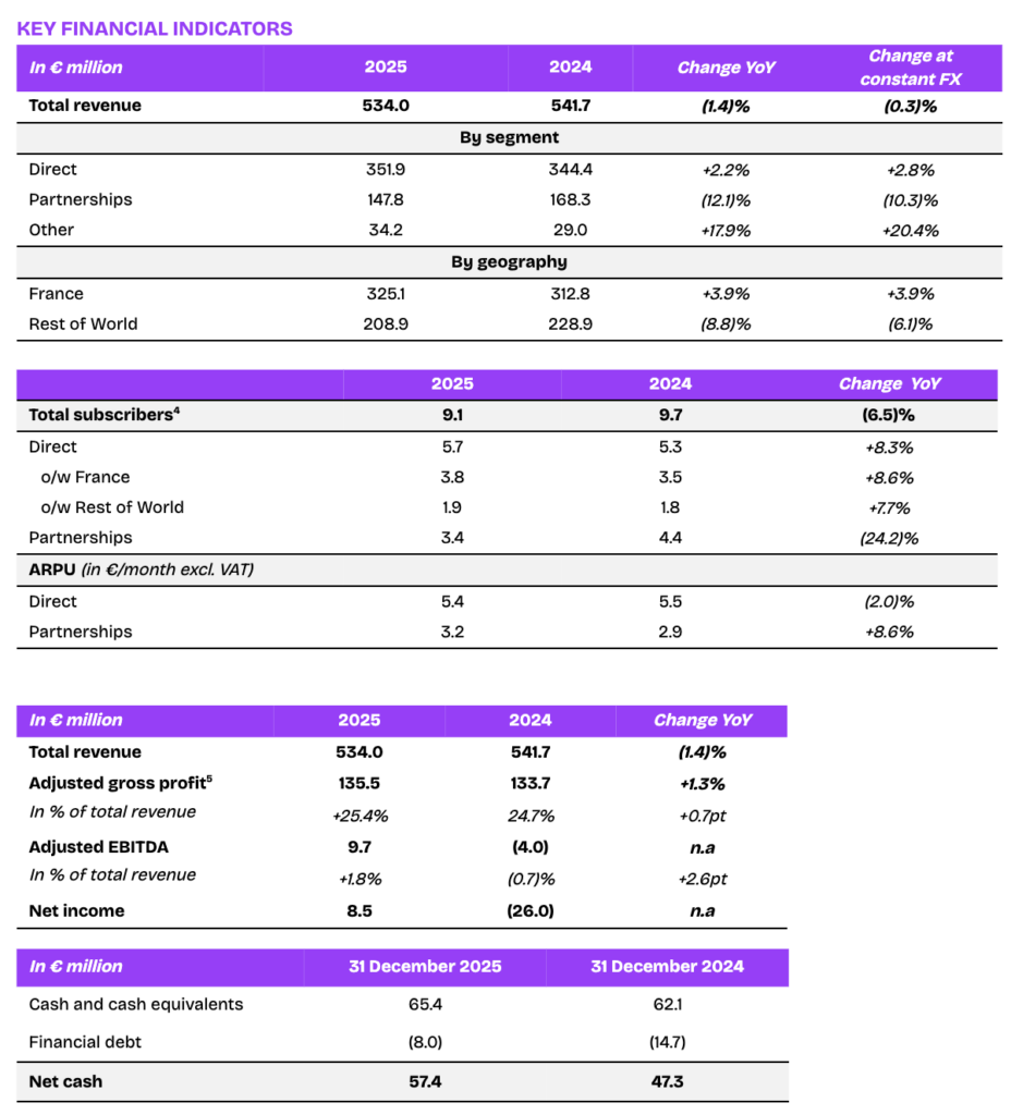 Adjusted EBITDA improved sharply to €9.7 million in 2025 compared to €(4.0) million in 2024, representing an improvement of €13.7 million, above expectations. Deezer achieves profitability for the first time on a full year basis. This performance reflects higher adjusted gross profit and strict management of the Marketing, Staff and G&A expenses, which decreased by €11.9 million YoY.