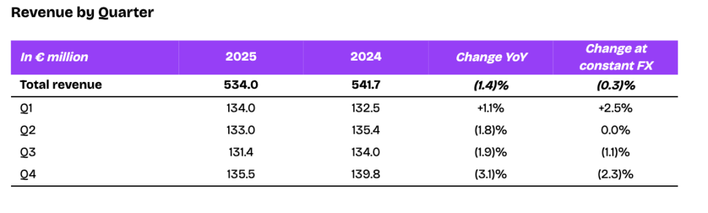 Consolidated revenue amounted to €534.0 million in 2025 compared to €541.7 million in 2024, or down (1.4)% at current currency and (0.3)% at constant currency, within the guidance. Direct revenue amounted to €351.9 million in 2025 compared to €344.4 million in 2024, representing an increase of €7.5 million, or +2.2% (+2.8% at constant currency). This revenue growth reflects the positive results of Deezer’s strategy driven by: (i) strong momentum in France with a YoY increase of the subscriber base to 3.8 million (+8.6%) and (ii) RoW back to growth (up +7.7%).