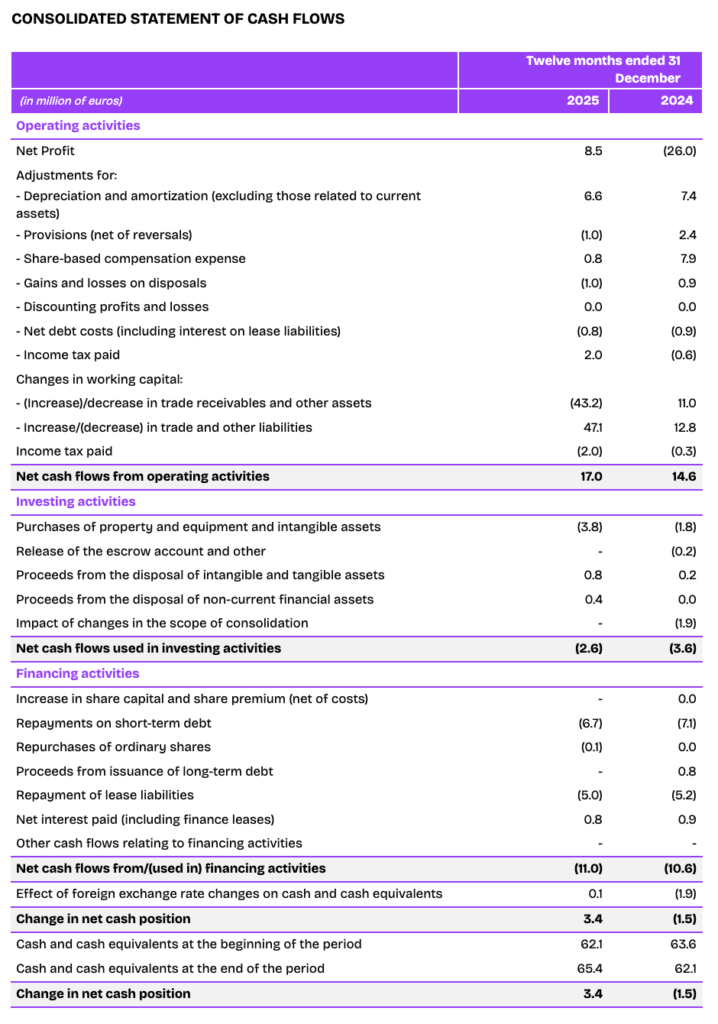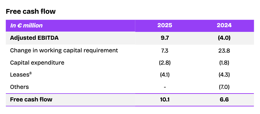 Free cash flow totaled €10.1 million in 2025 compared to €6.6 million in 2024, increasing by 3.5 million. This change mainly reflected the sharp improvement in adjusted EBITDA and no other cash items (including the impact of tax regularizations).