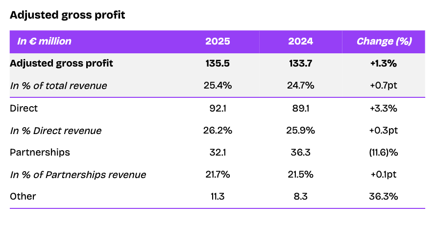 Adjusted Gross Profit amounted to €135.5 million in 2025 compared to €133.7 million in 2024, representing an increase of €1.8 million, or +1.3%, benefiting from a positive impact of white labelling solutions for hardware / media partners and the optimization of labels terms. Adjusted gross profit margin increased across all segments and came at 25.4% in 2025. Partnerships adjusted gross profit margin came at 21.7% (+0.1 pts) benefiting from better mix.