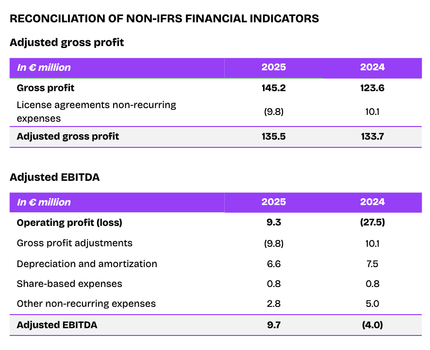 Operating income (EBIT) turned positive to €9.3 million in 2025 compared to €(27.5) million in 2024, representing a strong improvement of €36.7 million. This change mainly reflected increased gross profit and lower operating costs, including other non-recurring charges related to the licensing agreements. Operating margin came to 1.7% in 2025 (compared to (5.1)% in 2024).