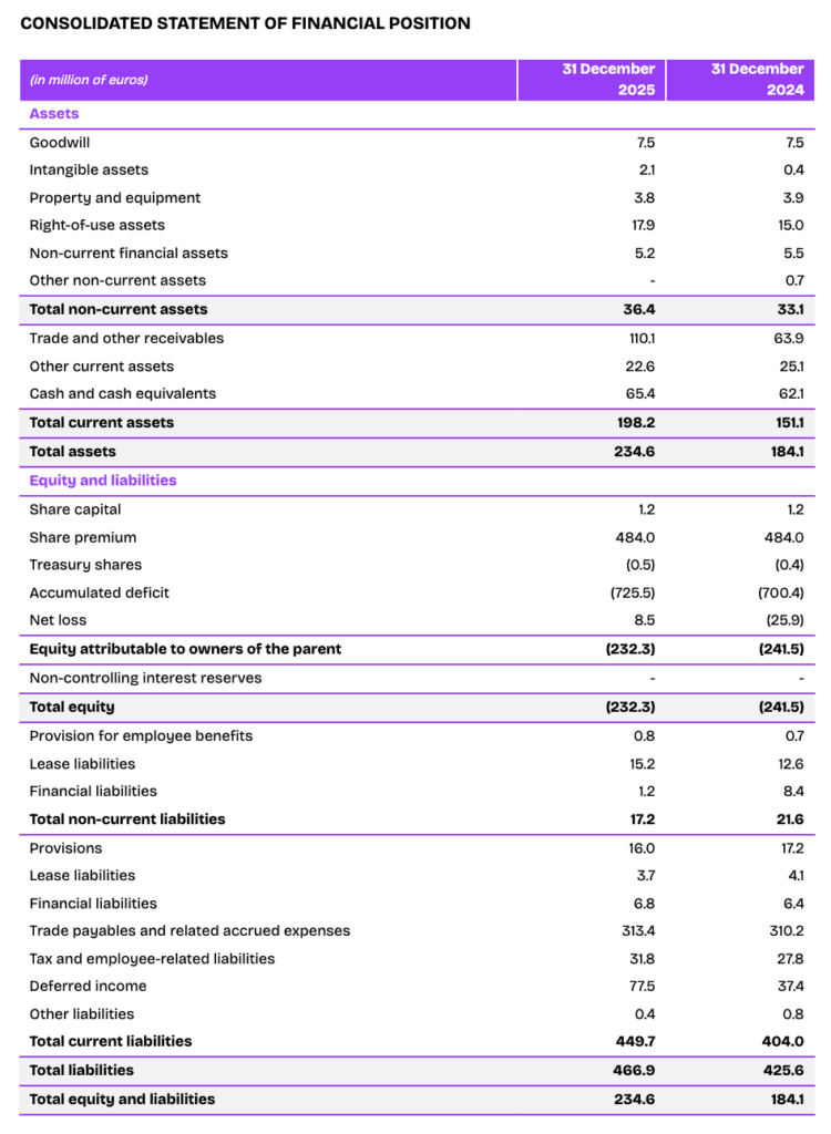 Cash and cash equivalents7 amounted to €65.4 million at the end of 2025 compared to 62.1 million at the end of 2024. Financial debt decreased by €6.7 million (repayment of state-guaranteed loan) and amounted to €8.0 million as at December 31, 2025. As a result, the Group’s net cash amounted to €57.4 million as at December 31, 2025 compared to €47.3 million as at December 31, 2024.