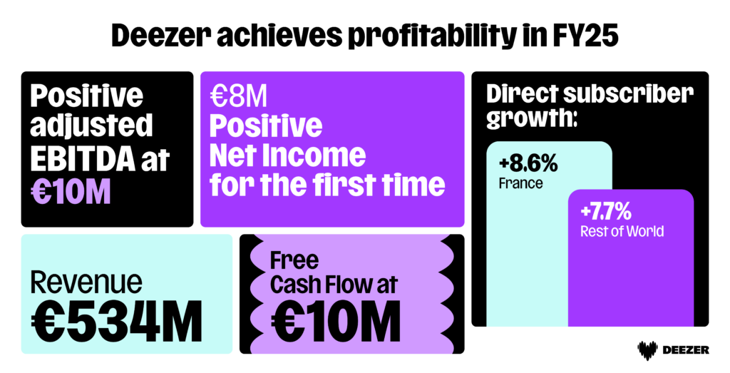 Alexis Lanternier, CEO of Deezer, said: “2025 marked a turning point for Deezer. For the first time in our history, we delivered positive net income, alongside sustained positive free cash flow and double-digit adjusted EBITDA. We met or exceeded all of our financial commitments and delivered solid performance, despite some headwinds in our Partnerships segment. Our strategy is gaining traction and delivering tangible results. GenZ audiences are increasingly connecting with the Deezer brand, and we are seeing continued subscriber growth in France and a return to growth in the Rest of World. Our leadership on AI-music transparency and fair artist remuneration has strengthened our reputation across the industry. Deezer is recognized as a platform that genuinely cares about music, artists, and fans. We enter 2026 from a position of strength with improved visibility and a leaner cost base. After a disciplined test-and-learn phase, we are now scaling what works. We have a clear roadmap, strong execution focus, and the ambition to make Deezer the most trusted music platform for fans, artists, and partners worldwide, continuing to lead the way in helping music thrive”.