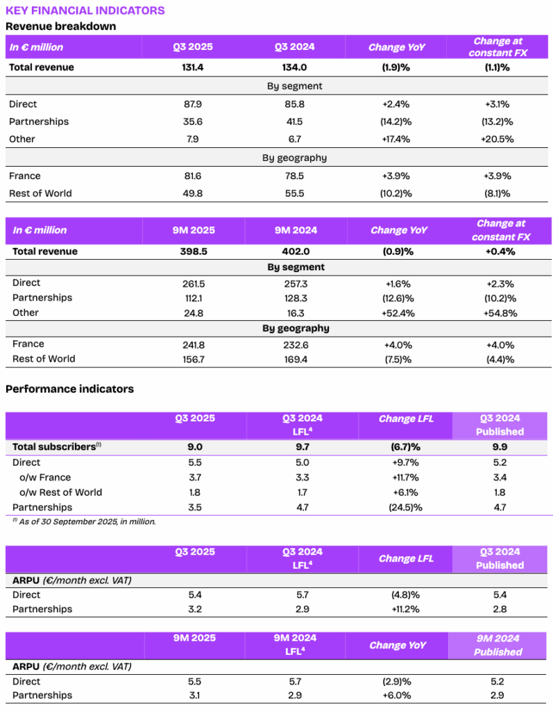 Consolidated revenue amounted to €131.4 million in Q3 2025, nearly stable compared to Q3 2024 (-1.1% YoY and -1.9% at constant currency due to FX effect in Brazil). This reflects the sustained momentum of the Direct subscriber base in France with higher share of family offers in the mix and a stronger contribution from the Other segment, offset by the anticipated revenue decline from partnerships.