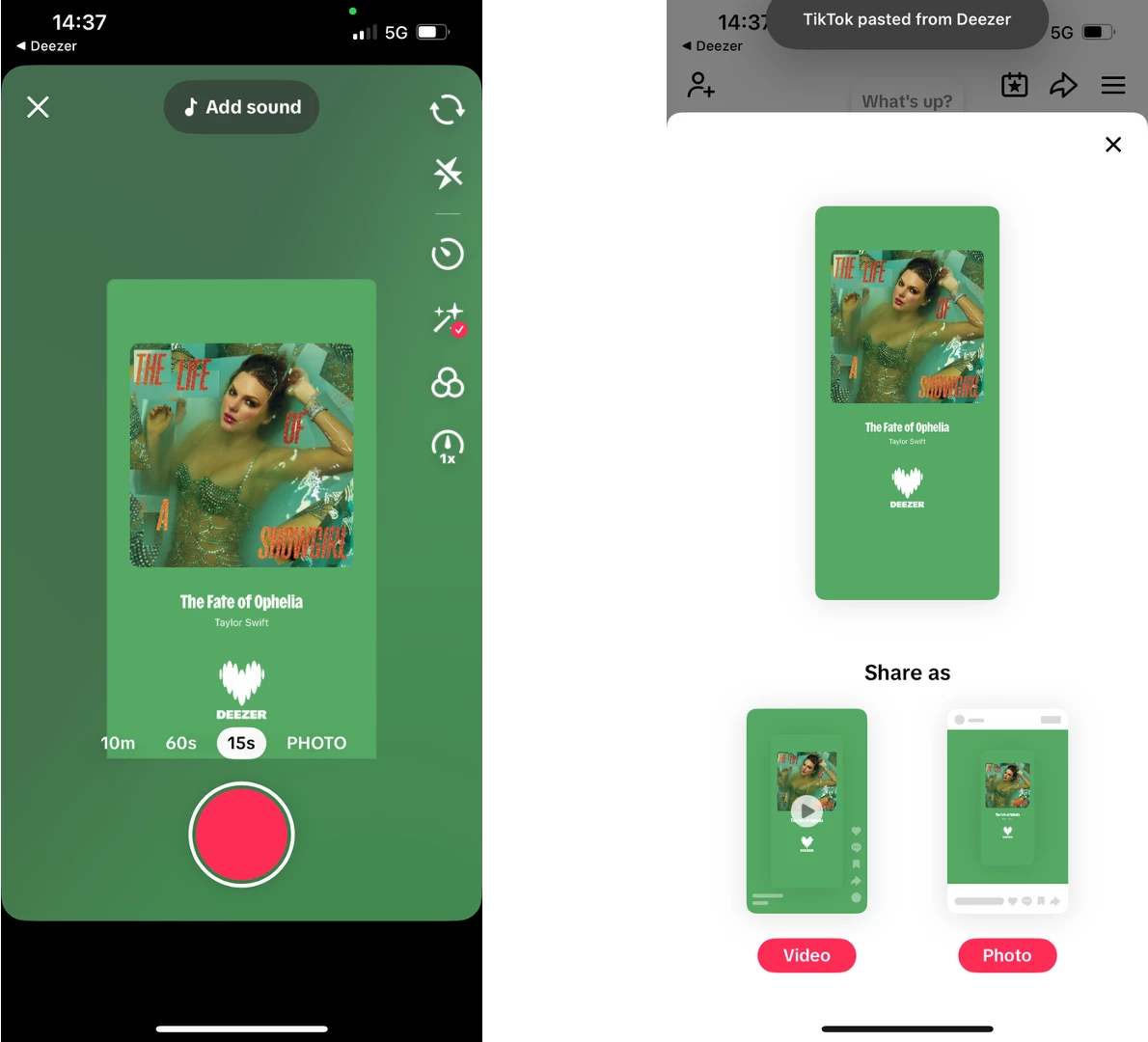 Just tap the Share button in Deezer and choose what you’d like to post on TikTok: