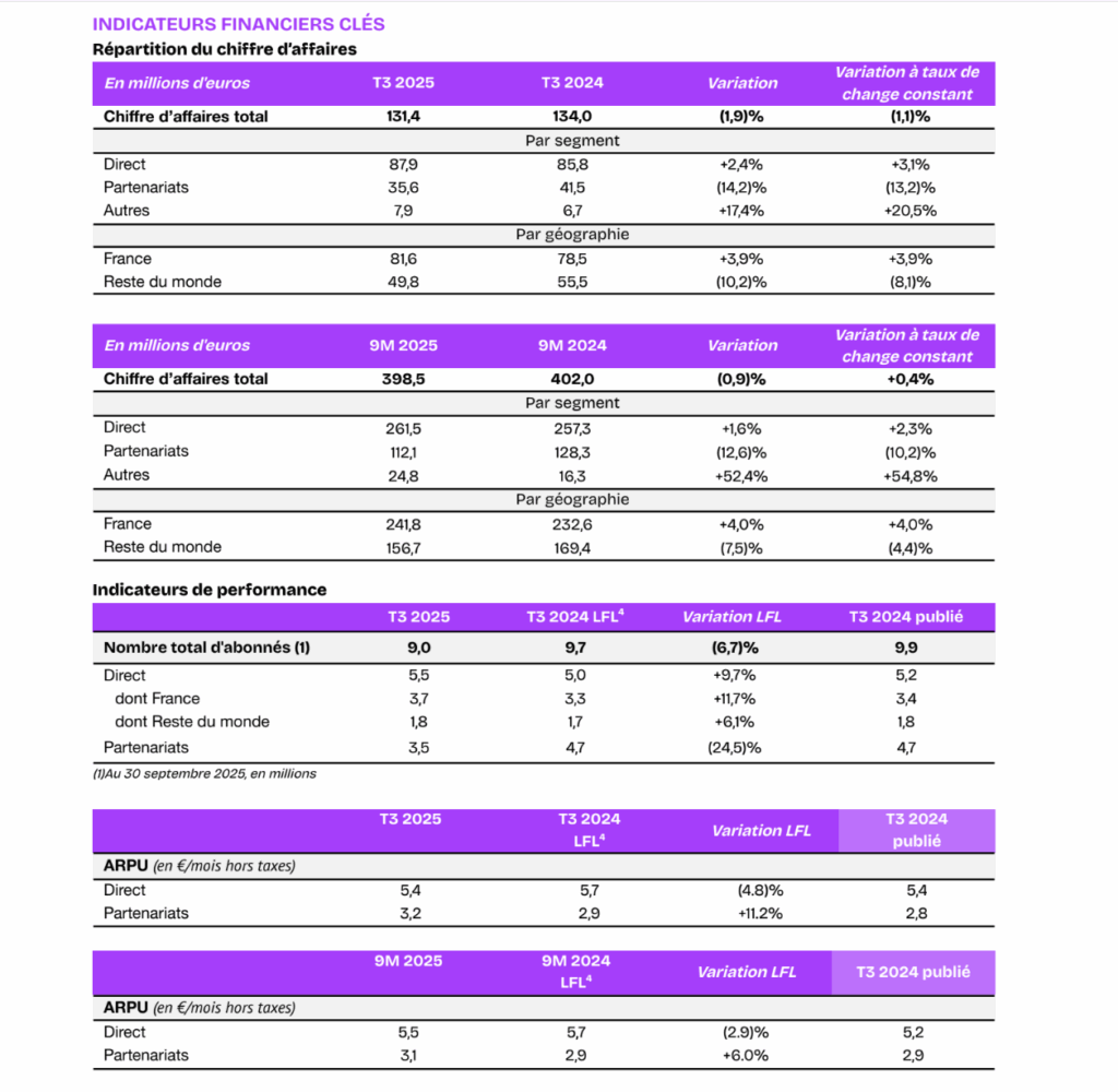 Le chiffre d’affaires des Partenariats s’élève à 35,6 millions d’euros au T3 2025, contre 41,5 millions d’euros au T3 2024, en baisse de -14,2 % (–13,2 % à taux de change constant). Cette évolution reflète principalement l’impact résiduel du changement de modèle de Mercado Libre, partiellement compensé par la contribution positive de RTL+ et de nouveaux partenariats de plus petites tailles. Parallèlement, l’ARPU a augmenté de +11,2 % sur un an, pour atteindre 3,2 €, grâce à une amélioration du mix.