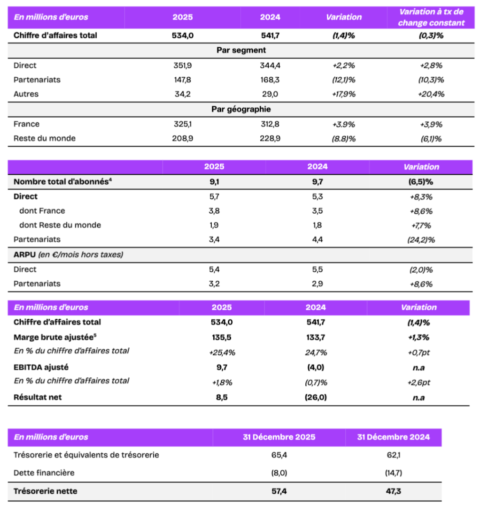 Le chiffre d’affaires Direct s’établit à 351.9 millions d’euros au 31 décembre 2025 contre 344,4 millions d’euros en 2024, soit une hausse de 7,5 millions d’euros (+2,2% à changes courants et +2,8% à taux de change constant). Cette croissance reflète les résultats positifs de la stratégie portés par : (i) une forte dynamique de croissance en France, avec une augmentation du nombre d’abonnés à 3,8 millions (+8,6 %), et (ii) un retour à la croissance dans le Reste du Monde (+7,7 %).