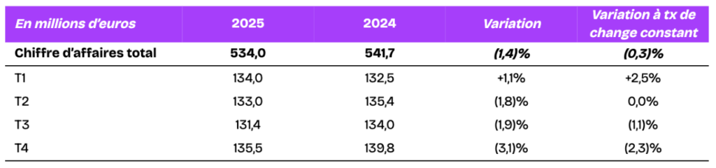 Le chiffre d’affaires consolidé s’élève à 534,0 millions d’euros au 31 décembre 2025, contre 541,7 millions d’euros au 31 décembre 2024, soit (1,4)% à taux de changes courants et (0,3)% à taux de changes constants, conforme à l’objectif.