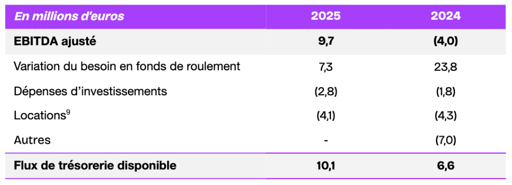 Le flux de trésorerie disponible s’élève à 10,1 millions d’euros au 31 décembre 2025, contre 6,6 millions d’euros au 31 décembre 2024, soit une hausse de +3,5 millions d’euros. Cette évolution s’explique principalement par l’amélioration de l’EBITDA ajusté et l’absence d’autres éléments de trésorerie (éléments non récurrents, notamment l’impact des régularisations fiscales).