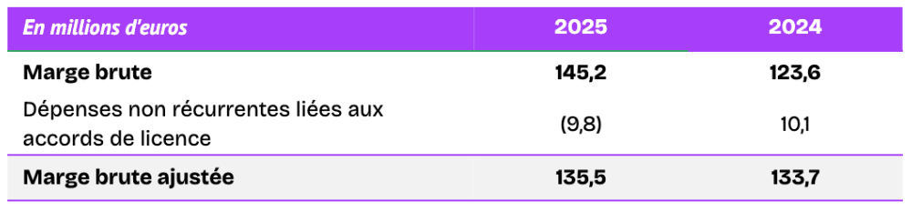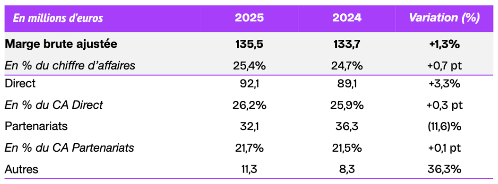 La marge brute ajustée s’est élevée à €135,5 millions d’euros au 31 décembre 2025, contre 133,7 millions d’euros au 31 décembre 2024, soit une hausse de +1,8 million d’euros sur un an (+1,3%), soutenue par l’impact positif des solutions en marque blanche pour les partenaires hardware et médias et l’optimisation des accords avec les labels. En conséquence, la marge brute ajustée progresse sur l’ensemble des segments, et s’établit à 25,4% en 2025. La marge brute ajustée des partenariats est de 21,7% (+0,1 points) grâce à un meilleur mix.