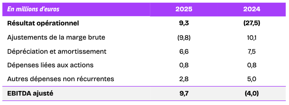 L’EBITDA ajusté s’améliore fortement et s’établit à 9,7 millions d’euros au 31 décembre 2025, contre (4,0) millions d’euros au 31 décembre 2024, soit +13,7 millions d’euros. Deezer dépasse le seuil de profitabilité pour la première fois sur une année pleine. Cette bonne performance s’explique par la hausse de la marge brute ajustée couplée à une gestion rigoureuse des frais généraux et des dépenses marketing, qui ont diminué de 11,9 millions d’euros par rapport à 2024.