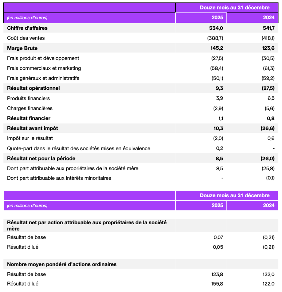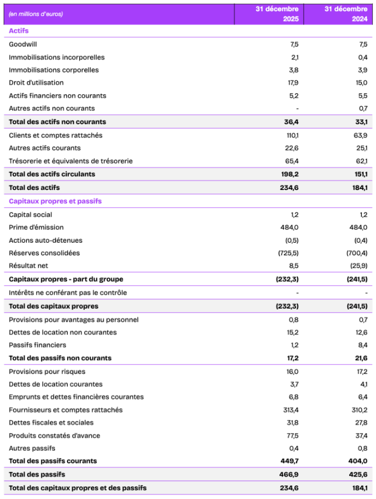 Le résultat net ressort positif à 8,5 millions d’euros au 31 décembre 2025 contre (26,0) millions au 31 décembre 2024, tenant compte d’ une amélioration des marges opérationnelles et des reprises de provisions compte tenu de perspectives plus favorables.