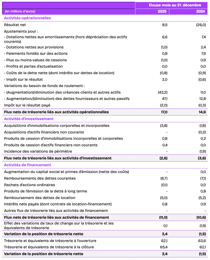 La trésorerie et équivalents de trésorerie8 ressort à 65,4 millions d’euros à fin décembre 2025 contre 62,1 millions à fin décembre 2024. Les dettes financières baissent de 6,7 millions (correspondant au remboursement du prêt PGE) et s’élèvent à 8,0 millions d’euros au 31 décembre 2025. En conséquence, la trésorerie nette des dettes financières est de 57,4 millions d’euros au 31 décembre 2025 contre 47,3 millions d’euros au 31 décembre 2024.