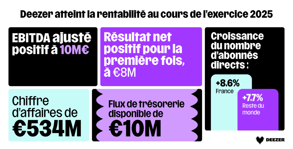 Alexis Lanternier, directeur général de Deezer, commente : « 2025 a marqué un tournant pour Deezer. Pour la première fois de notre histoire, nous avons enregistré un résultat net positif, accompagné d’un flux de trésorerie disponible à nouveau positif et un EBITDA ajusté à deux chiffres. Nous avons atteint ou dépassé l’ensemble de nos engagements financiers et réalisé une performance solide, malgré des vents contraires dans notre segment Partenariats.
