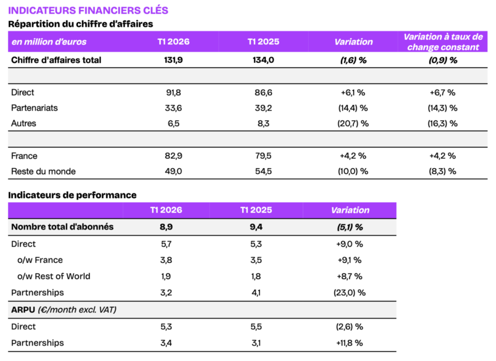 - Partenariats à 3,2 millions d’abonnés au 1er trimestre 2026, en baisse de (23,0) % sur un an, reflétant le dénouement progressif du partenariat avec Mercado Libre. La montée en puissance se poursuit progressivement sur les accords récemment signés (notamment Telenor, Molotov, Norlys, Fitness Park, Chippu, EDF). L’ARPU Partenariats progresse de +11,8 %, grâce à un mix plus favorable.